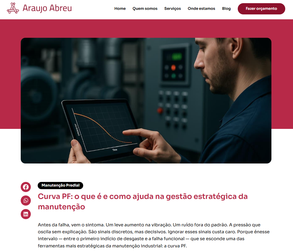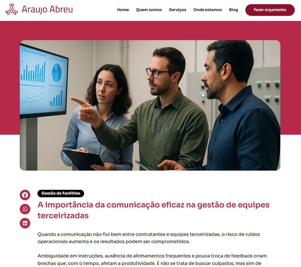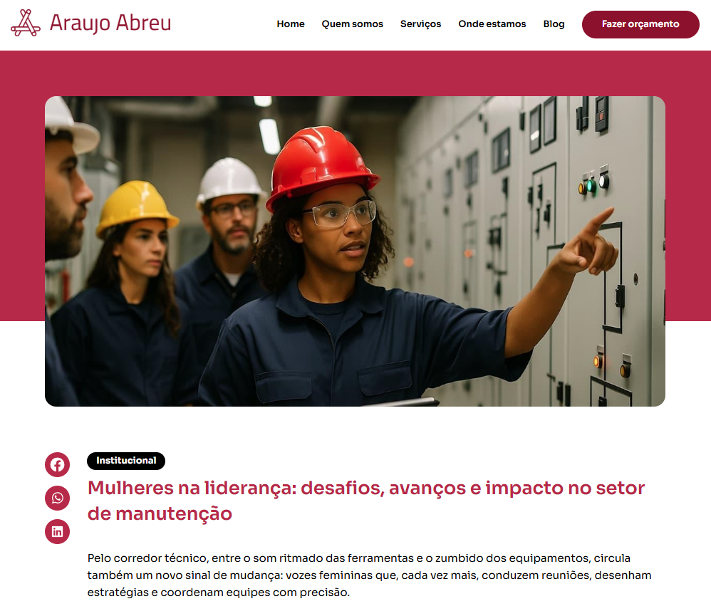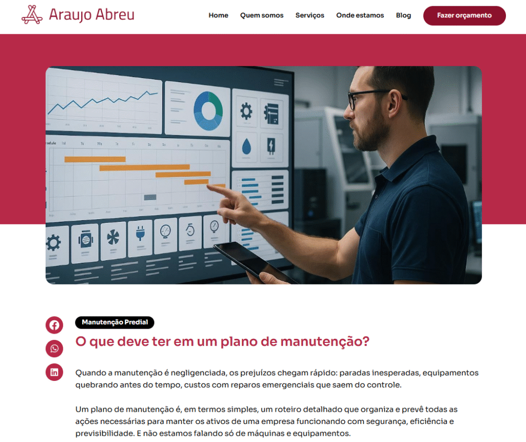 Atuei no desenvolvimento de conteúdos institucionais para o blog e redes sociais, com foco no setor de manutenção predial e gestão de equipes. Sugeri pautas alinhadas ao posicionamento da marca, desdobrei os temas em textos informativos e estratégicos e adaptei os conteúdos para publicações nas redes sociais, com linguagem acessível e técnica ao mesmo tempo.